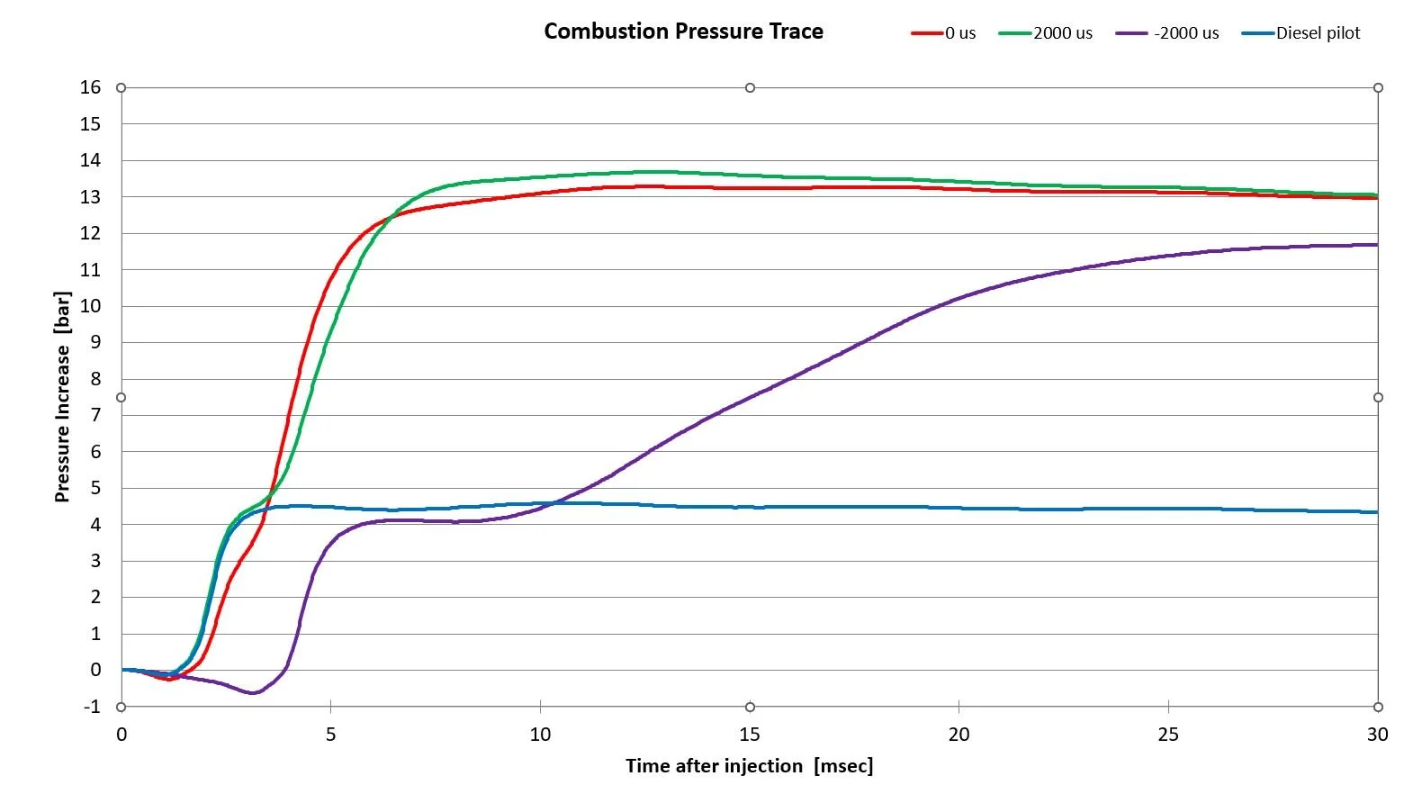Example: Methanol and Diesel pilot fuel. Pressure development vs. time when using different fuel injection order and time delays.